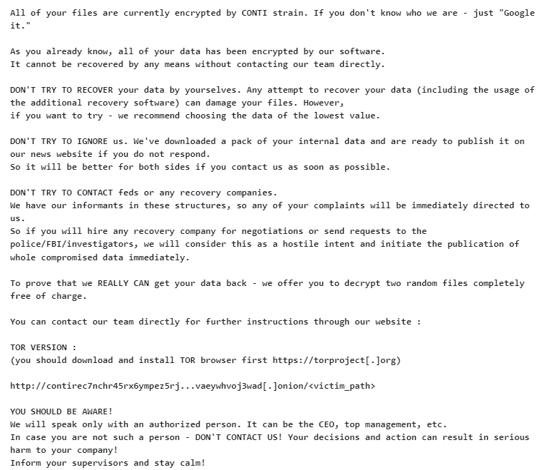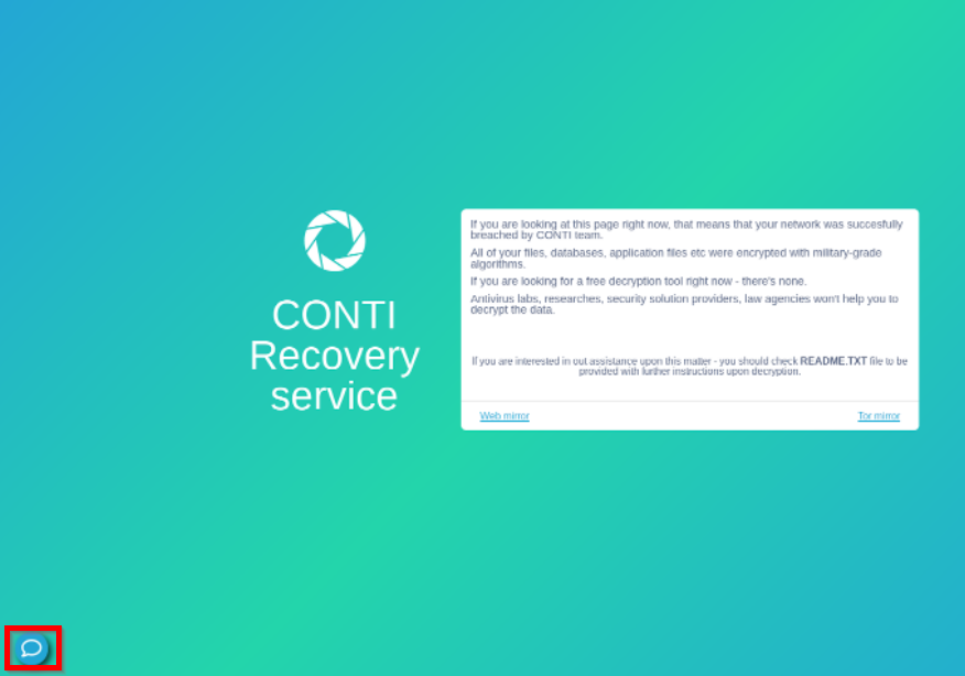 The ransomware note has a direct link to a victim-specific chat portal. The Conti portal contains a landing page that instructs the user to follow the instructions in the README.txt file that is written to disk after file encryption.
