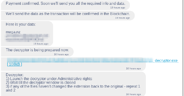 After the attacker and victim have an agreement, the victim sends bitcoin to the designated address and the attacker produces a decryption key using the victim’s ID. However, there are Conti affiliates that simply take the cash and disappear, refusing to provide the decryption key as promised: it is not a 100% guarantee that the victim receives back its files.