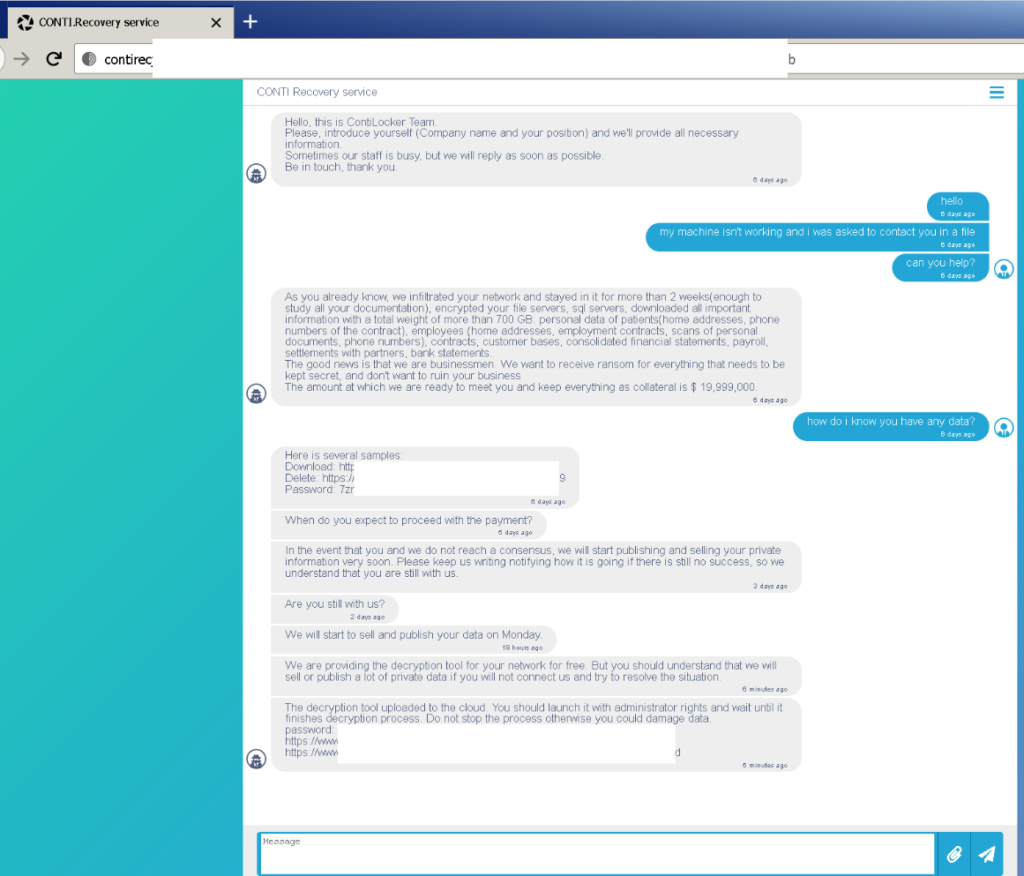 When the victim contacts the Conti Recovery Service, the Conti affiliate sends the total captured file size and enumerated system information to the user. Conti affiliates do this to prove that the data was compromised and that the data is in Conti’s possession. The February 2022 leak also provided chat files, which give clear insight into how Conti operates and how their communication with a victim is done.
