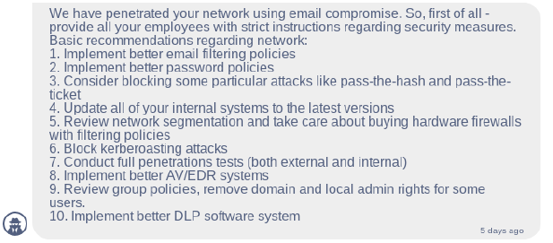 As an extra service, Conti affiliates will also send a recommendation message in the chat with the victim, providing advice on how to protect against future attacks: